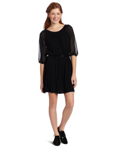 Elbow sleeve jersey dress with sheer chiffon sleeves. Gathering at the neckline. Removable belt.