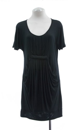 This dress by Ella Moss in black features a jersey fabric, short sleeve, scoop neckline, pleating at bodice, cent banded at waist with pleating that creates a scallop drape front, and it is a pull over.