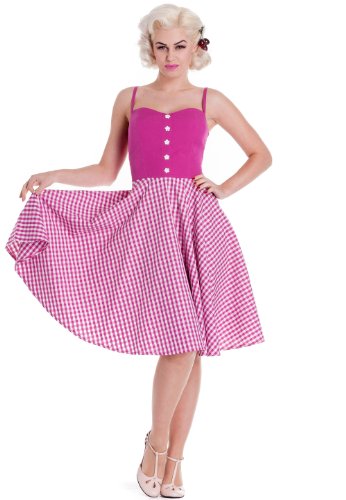 From the Hell Bunny 2013 Spring / Summer collection, the Hell Bunny Pink Saturday Dress has a cute white and pink gingham check pattern with a plain pink bodice. The fitted bodice has white daisy buttons decorating the front and delicate adjustable shoulder straps. Either side of the concealed zip in the back are smocked elastic panels helping this dress fit perfectly. The Hell Bunny Pink Saturday Dress main features include;