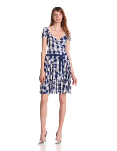 KAMALIKULTURE Women's Short Sleeve Sweetheart Flair Dress, Cobalt/Off-White, Small