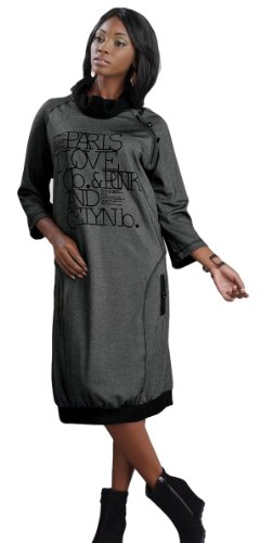 This loose comfortable knit dress is trimmed with a rib knit collar and hem band. There are zipper pockets and a zipper at the left shoulder. A flocked design embellishes the front. The dress measures approximately 40in. in length. Imported Fabric. Dry clean only.