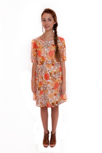 The ultimate vintage style dress, the retro pattern in the Floral 3/4 Sleeve dress by designer Tulle, features a warm floral pattern with a blend of gold, brown, pink and orange hues. The dress features an elastic waist band at the natural waist. The dress itself is lined in white on the body of the dress, but the sleeves are sheer. The sleeves are 3/4 length and the shoulders do feature a slight poof and the hem of the sleeve features a button closure. The dress is mid-thigh length. Made in China. Fabric and lining is 100% polyester. Machine wash on gentle cycle. Lay flat to dry.