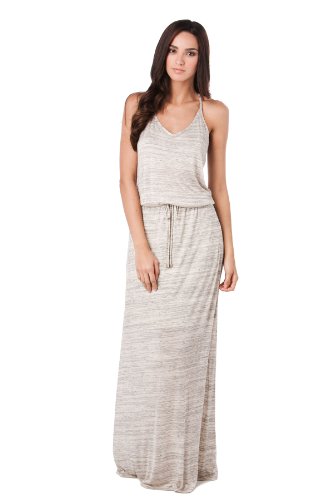 Maxi cover dress with dropped waistline. Features a racerback silhouette and a drawstring tie with metallic bead accents.