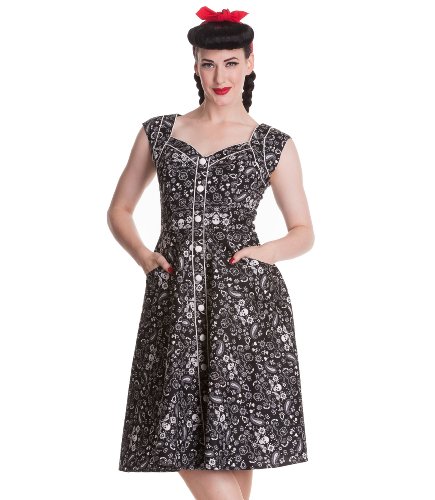 From the Hell Bunny Spring Summer collection, 2013. The Hell Bunny Black Colorado Dress also comes in red. The pattern is paisley with a repeated skulls and pistols design. The length of the dress has a row of chunky white false buttons on the front with white pipe trim either side. This dress is a sleeveless dress and the white pipe trim gives a unique style on the shoulders and bustline. Main features include;