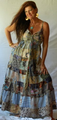 BLUE DRESS HALTER PATCHED BATIK ANTIQUE - FITS (ONE SIZE) - M L XL 1X 2X - C549S LOTUSTRADERS