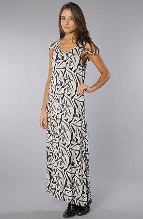 BOTB by Hellz Bellz Women's The Bizness Dress. Model is wearing a size Small Sleeveless maxi dress with contrasting abstract and paint splatter screen print throughout; strap details at upper arms; heart-shaped cut out with mesh and chain detail on upper back; 95% rayon, 5% spandex. By BOTB by Hellz Bellz.