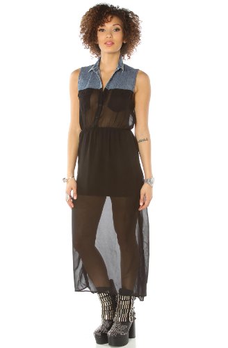 Motel Women's The Shelley Denim & Sheer Contrast Dress. The Motel Shelley Denim & Sheer Contrast Dress in Black This sheer buttondown maxi dress stays on trend with a contrast denim yoke and a mix of prep and macabre. Wear this versitile style to work, then easily transition to evening with the right shoes and accessories. Check out online street boutique for styling hints. Dual chest pockets Fitted waist 51 length 95% polyester, 5% elastane By Motel Size & Fit : Model is wearing a size Small Our model Lealyn is 5'7 tall with a 33 bust, 24 waist, and 35 hips.