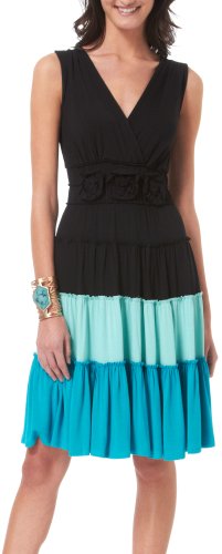 Comfort and style collide in this sleeveless dress by Sangria offeringa surplice neckline, empire waist with rosette trim, and tier designskirt. Easy wear and care! Spandex. Rayon.