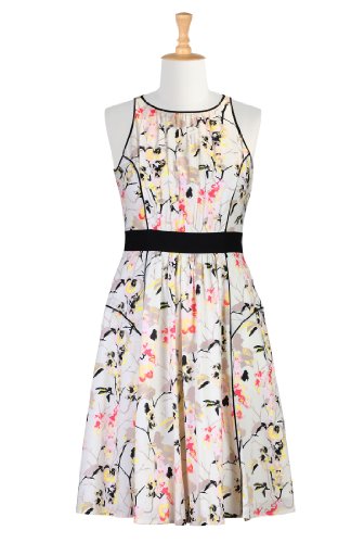 eShakti Women's Tipped trim floral print dress L-14 Short Cream multi/black