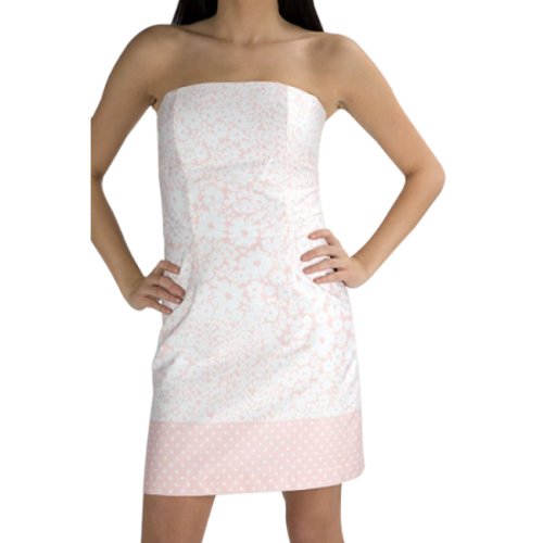 This floral strapless dress features a floral pattern on top with a polka dot pattern on the bottom. This black and white dress is made from 100% cotton. Strapless dress with zippered back.
