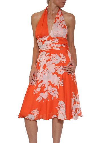 This fully lined silk Marilyn Monrow inspired dress from Rose & Lula features a self tie halter, plunging neckline, pleat detailing on a 4.5" banded waist, a fluid flowing skirt and hidden back zipper closure.