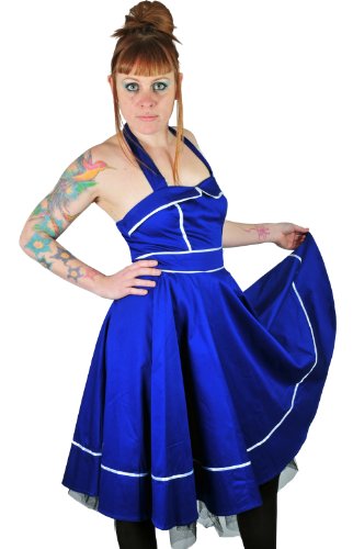 50s dress from H&R London in a navy blue cotton with white satin trim. This dress has halterneck ties, white trimmed collars and an elastic hem on the back to give a perfect fit. The skirt is a full circle and has a black cotton and net trimmed underskirt underneath. To add more volume and a swing style to this dress you could add a 25" length petticoat. You will get the option to do this if you add the dress to your basket. Check the size guide tab for measurements as the waist comes up a size smaller on this dress. Choose up a size according to your own waist size. The main features of the H&R London Navy 50's Dress include;