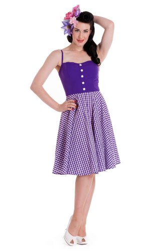 From the Hell Bunny 2013 Spring / Summer collection, the Hell Bunny Lavender Saturday Dress has a cute white and purple gingham check pattern with a plain purple bodice. The fitted bodice has white daisy buttons decorating the front and delicate adjustable shoulder straps. Either side of the concealed zip in the back are smocked elastic panels helping this dress fit perfectly. The Hell Bunny Lavender Saturday Dress main features include;