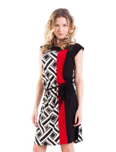 Geometrical print covers the entire dress will two bold black and red stripes disrupt the pattern on one side making it alluring and interesting. The waist is belted and neck is a scoop shape. Comfortable slip-on style.