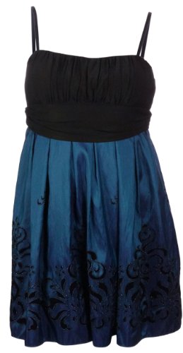 This beautiful party dress from S.L. Fashions features full lining, concealed back zipper with hook & eye closure, adjustable spaghetti straps, sleeveless, ruched jersey top, padded bust, and flared taffeta skirt with velvet flocking.