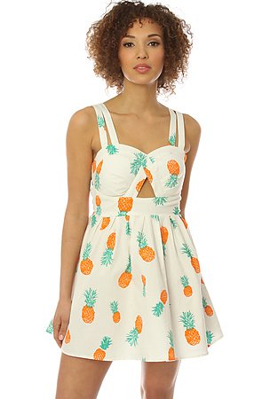 Reverse Women's The Pineapple Tie Back Dress. The Reverse Pineapple Tie Back Dress in White Grab some sandals and a mariachi band and get this banana boat filled up with pineapples you crazy chica! This sweet pineapple printed frock has all the hipster summer flair a girl needs. Say yes to fruity clothes and people! Check out all the indie styles Reverse is offering up this season on our online street boutique. Bra Cup Bodice Center Front Cutout Open Back with Tie Closure Center Back Invisible Zipper and Elasitic Back Waist Skirt Length: 18.5 Wash Seperately 100% Cotton Imported By Reverse Size & Fit The model is wearing a size Small. Our model Lealyn is 5'7 tall with a 33 bust, 24 waist, and 35 hips.