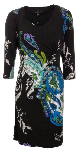 Ronni Nicole's Paisley Printed Jersey Dress features full lining, pull over style, scoop neck front, 3/4 sleeves, side ruched detailing, printed paisley pattern, and jersey stretch fabric.