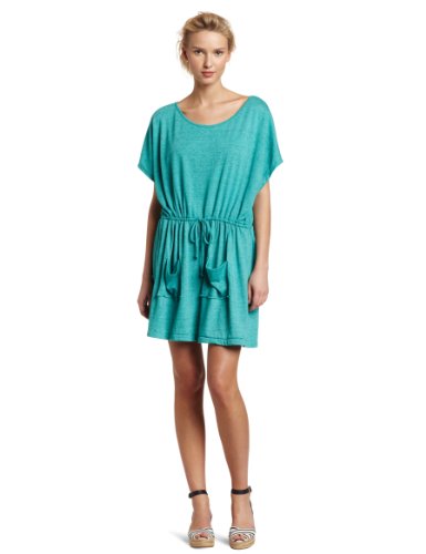 Women's relaxed-fit dolman-sleeve tunic dress with bound boat-neck, Two front pockets and drawstring cord at waist