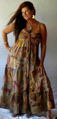 BROWN DRESS HALTER PATCHED BATIK ANTIQUE - FITS (ONE SIZE) - M L XL 1X 2X - C545S LOTUSTRADERS