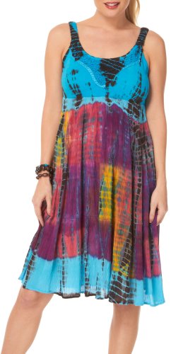 A casual comfort by Lola P provides a stylish tie dye print, knit bodice, tiered gauze design & a round neckline with crochet. Cotton. Rayon.