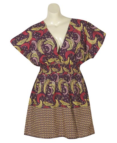 Woven border print dress. Surplice bodice is low cut. Smocked elastic waistband all around. Open cap sleeve. Lined. Material: 100% cotton Origin: Made in India Cleaning:Hand Wash