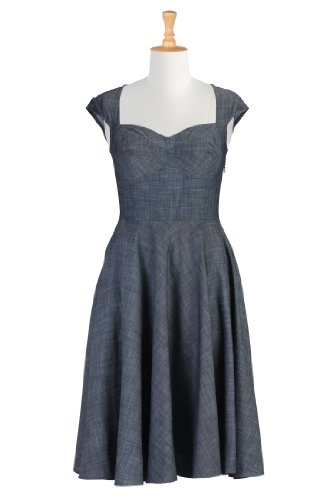 - Slips on over head; partial side hidden zip closure , Sweetheart neckline , Elastic smocked center back , Full circle skirt , Side seam pockets, Below knee length , Cotton, woven chambray, cross-dyed, no stretch, midweight , Machine wash