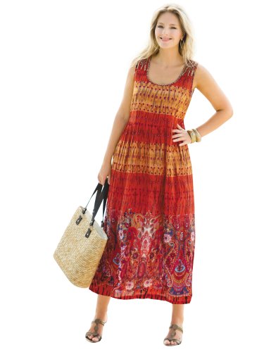 Our Gently Shaped Collection offers new options designed to complement your womanly proportions. We flatter your curves with beautiful looks created to follow your figure's contours. Breeze through summer in our flatteringly styled empire waist printed tank dress. Trend-right print with beading at the shoulder and neckline. Shaped A-line fit. 100% woven cotton. Machine wash. Imported. Length: 50".