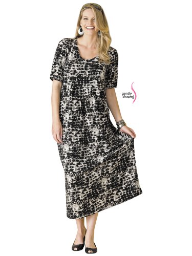 Our Gently Shaped Collection offers new options designed to complement your womanly proportions. We flatter your curves with beautiful styles created to follow your figure's contours. Soft knit essentials have a smooth resilient feel and natural wrinkle resistance, making them a real travel favorite. Empire waist and short sleeves. Shaped A-line fit. 92% polyester/8% spandex. Machine wash. Imported. Length: 51".