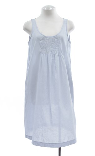 This dress by Eileen Fisher In In Sky Blue features a organic cotton fabric, scoop neckline with smocking detail, sleeveless, pull over and a knee length skirt.