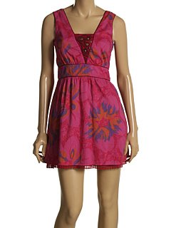 This dress by Free People in dark pink features cotton floral print fabric, V-neck insert with stud embellishments, sleeveless, criss cross detail at back, piping at waist, neck and sleeves, side zip closure, wide waistband, straight hem and lace trimmed lining.