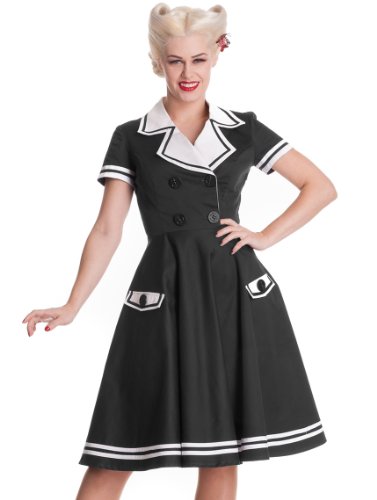 From the Hell Bunny Spring Summer 2013 range, this nautical dress in black cotton has that retro style perfect for this summer. The top is a short sleeved style with big, double lapels in white with black trim. The double breasted style front buttons up with chunky blue buttons, embossed with anchors. The false pockets on the sides are also in white and black trim with the same chunky anchor buttons. The skirt is a full circle and looks amazing with a Hell Bunny 25" white or black petticoat (not included). The main features for the Hell Bunny Black Seafarer Dress include;