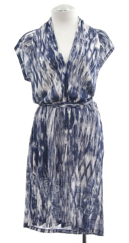 This dress by Velvet in navy features printed jersey fabric, deep V-neckline, short sleeves, self tie belted waist, straight hemline and pull over design.