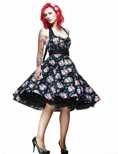 With a classic cut, this cotton 50s dress has that vintage look and full circle swing skirt which looks great with a Hell Bunny 25" petticoat underneath. As with all Hell Bunny dresses, an alternative twist on a classic style makes this dress something special. The print on the dress has a Japanese theme with an intricate and dark geisha design incorporating skulls, flowers, vipers and butterflies on a black background.