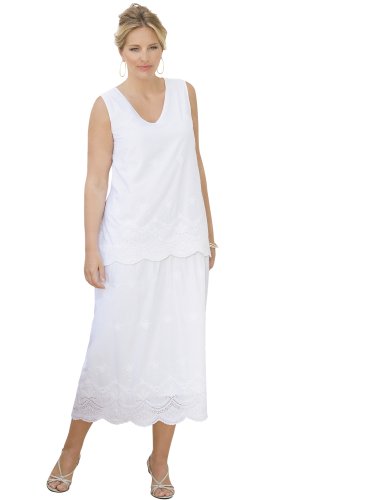 Sweetly romantic layered dress has scattered bouquets of tone-on-tone embroidery and deeply scalloped border designs. V-neckline, sleeveless. Shaped nicely with bust darts. Relaxed fit. 100% woven cotton with 100% cotton lining. Machine wash. Imported. Length: 50".
