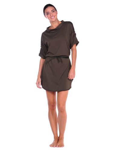 This is a versatile mini dress with all the designer details. Slight cowl neckline, with lower shoulder deconststructed seams, small pleats on the upper arm, and cuffed sleeves. Leather belt ties at the true waist. Shirt-tail hemline. Perfect worn with tall boots as shown on model, or with leggings and flats.